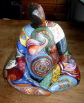 Beelden van papier maché, abstract beschilderd of met symbolen uit de 'inheemse kunst'. Symbolisch gezien: ik schep er plezier in van kranten met nieuws over oorlogen, geweld, kunst te scheppen.